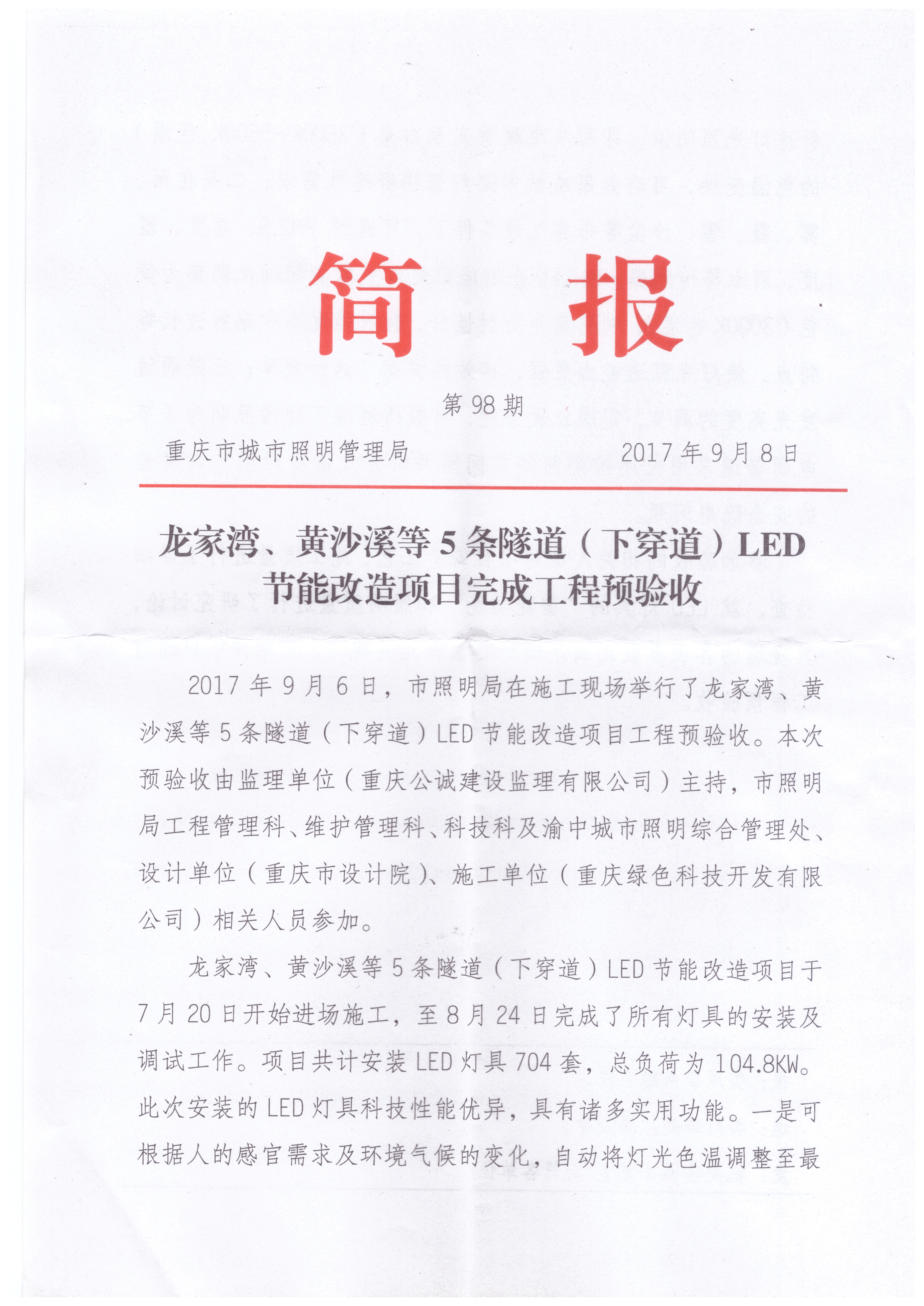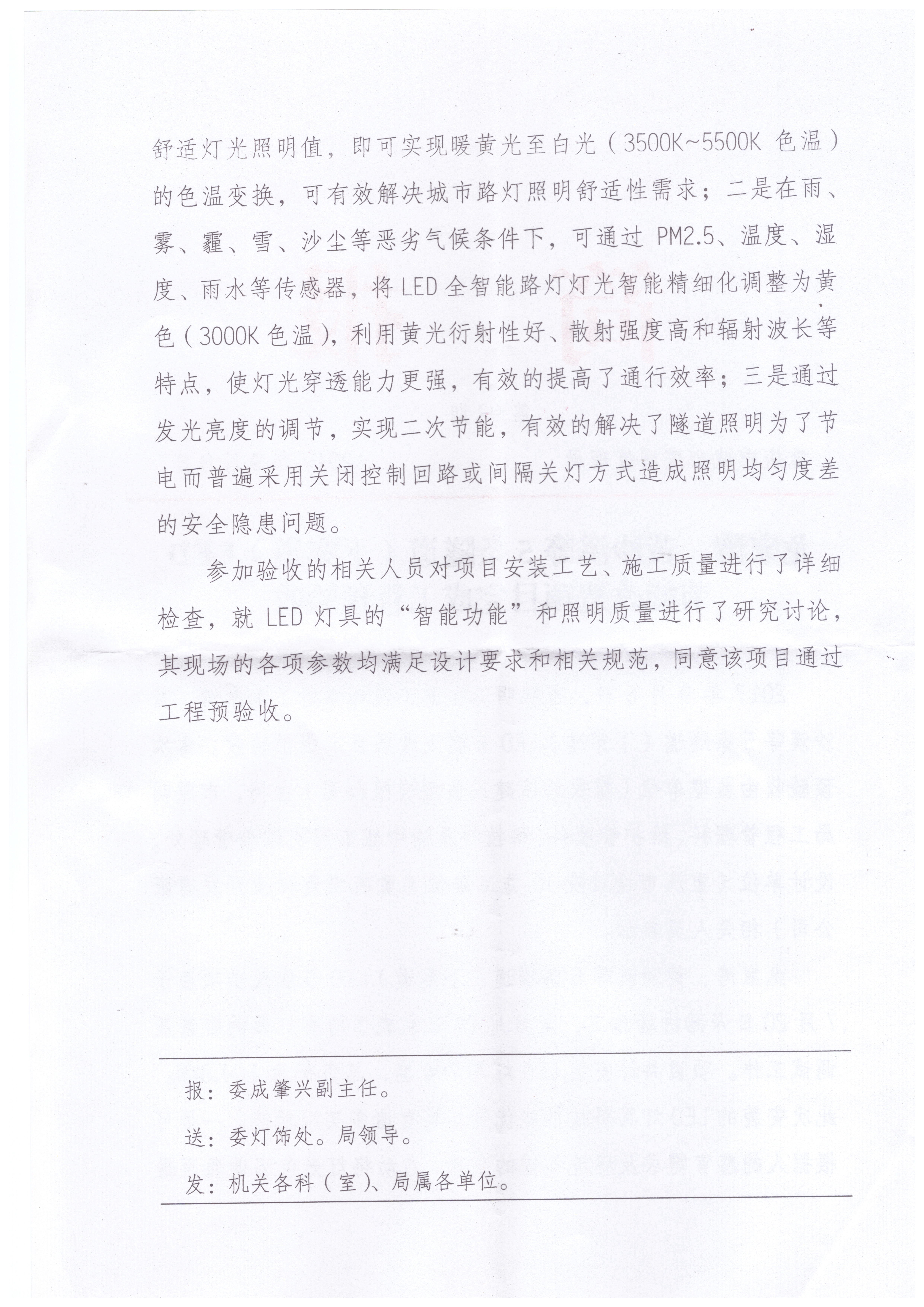 2017年7月31日,我司使用“中國創(chuàng)造”“互聯(lián)網(wǎng)+”多色溫防霧霾LED全智能路燈在重慶市龍家灣、黃沙溪、袁家崗、鵝嶺、陳家坪隧道實(shí)施科技節(jié)能改造工程已全面竣工。2017年9月6日,該項(xiàng)目建設(shè)單位重慶市城市照明管理局、監(jiān)理公司及設(shè)計(jì)公司對該項(xiàng)目進(jìn)行了現(xiàn)場預(yù)驗(yàn)收,參會人員對該創(chuàng)新專利產(chǎn)品作出了極高的評價(jià)。會后,重慶市城市照明管理局專門印發(fā)了《龍家灣、黃沙溪等5條隧道(下穿道)LED節(jié)能改造項(xiàng)目完成工程預(yù)驗(yàn)收》簡報(bào)(附后),其上級主管部門重慶市城市管理委員會對其進(jìn)行了新聞報(bào)道。